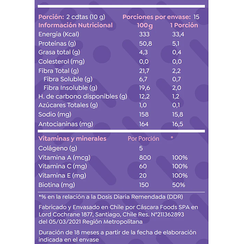 Ingredientes: Colágeno hidrolizado, Fibra de Arándano (Rescatado) , Fibra de Frutilla (Rescatada), Vitamina C, Vitamina E, Saborizantes Naturales, Vitamina A y Biotina